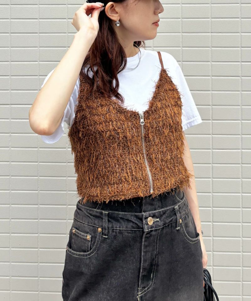 存在感もありつつすっきり着られるショート丈のラメフェザービスチェ。
