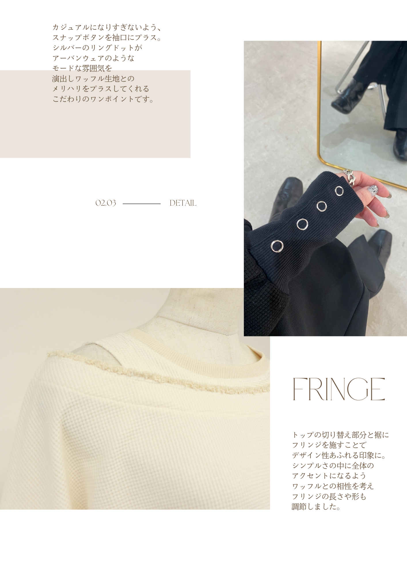 トップの切り替え部分と裾にフリンジを施すことでデザイン性あふれる印象に。