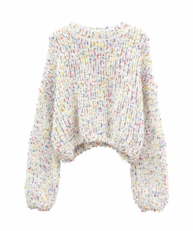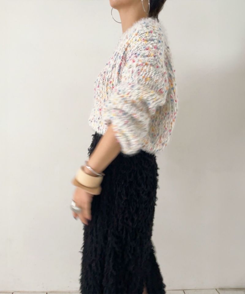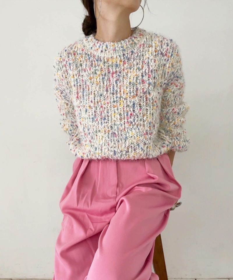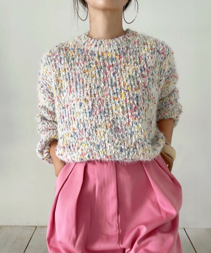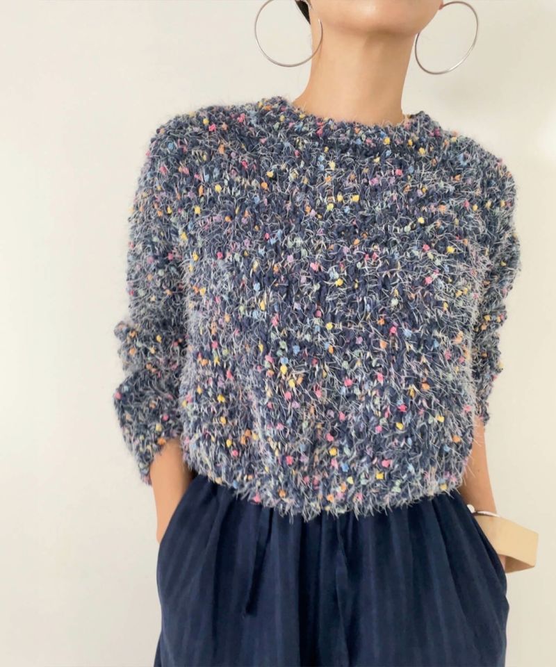 毛足の長いふわふわのシャギー糸と、カラフルなポコポコとしたミックスカラーの糸を使用したニットプルオーバー。