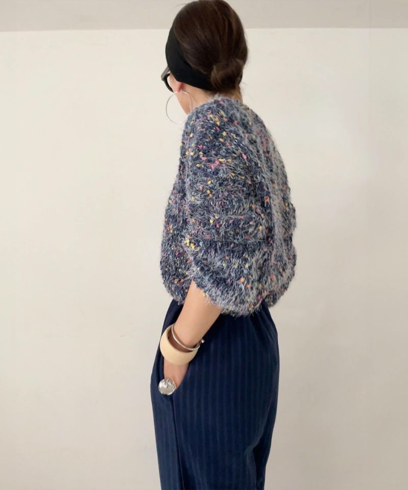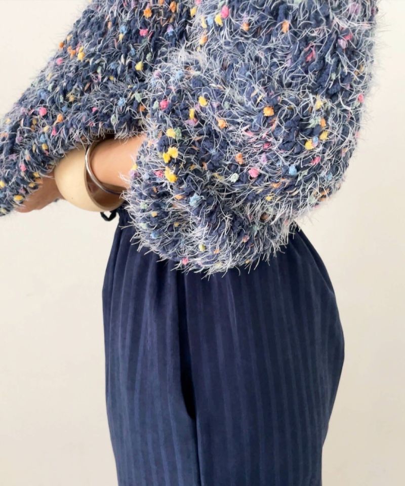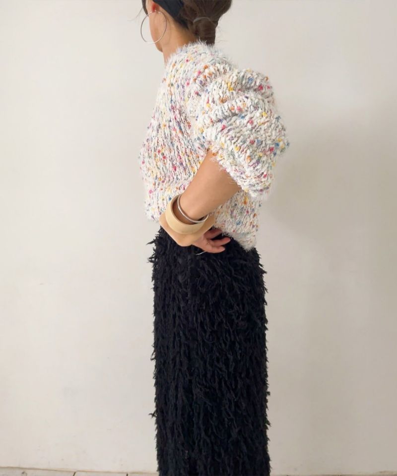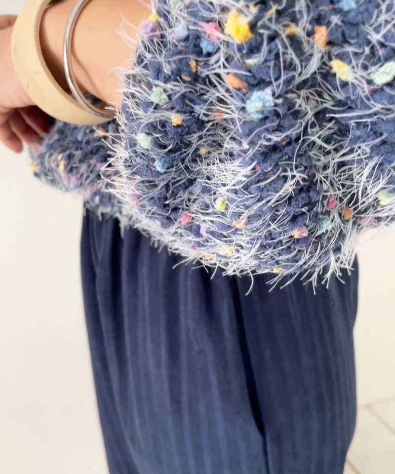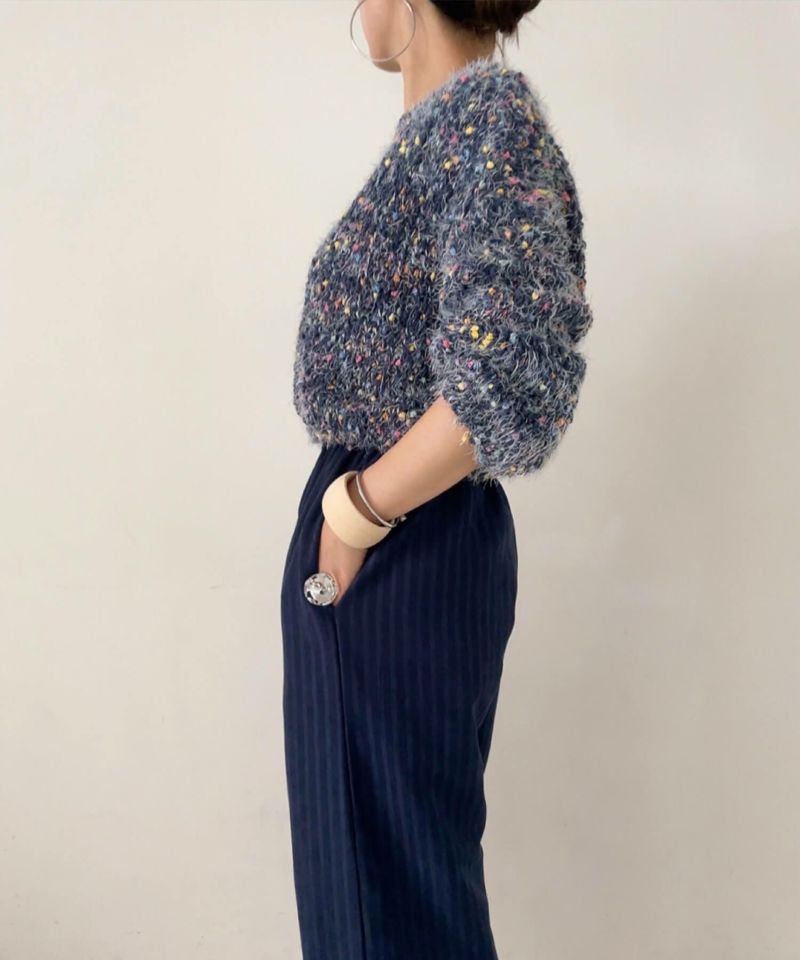毛足の長いふわふわのシャギー糸と、カラフルなポコポコとしたミックスカラーの糸を使用したニットプルオーバー。