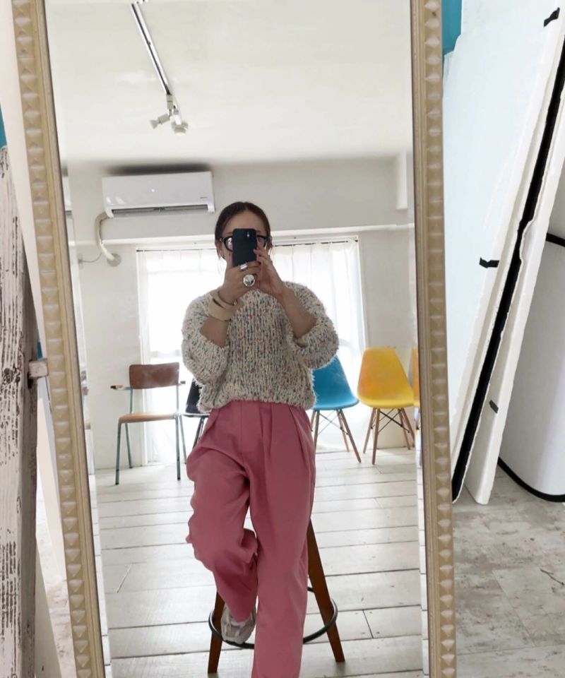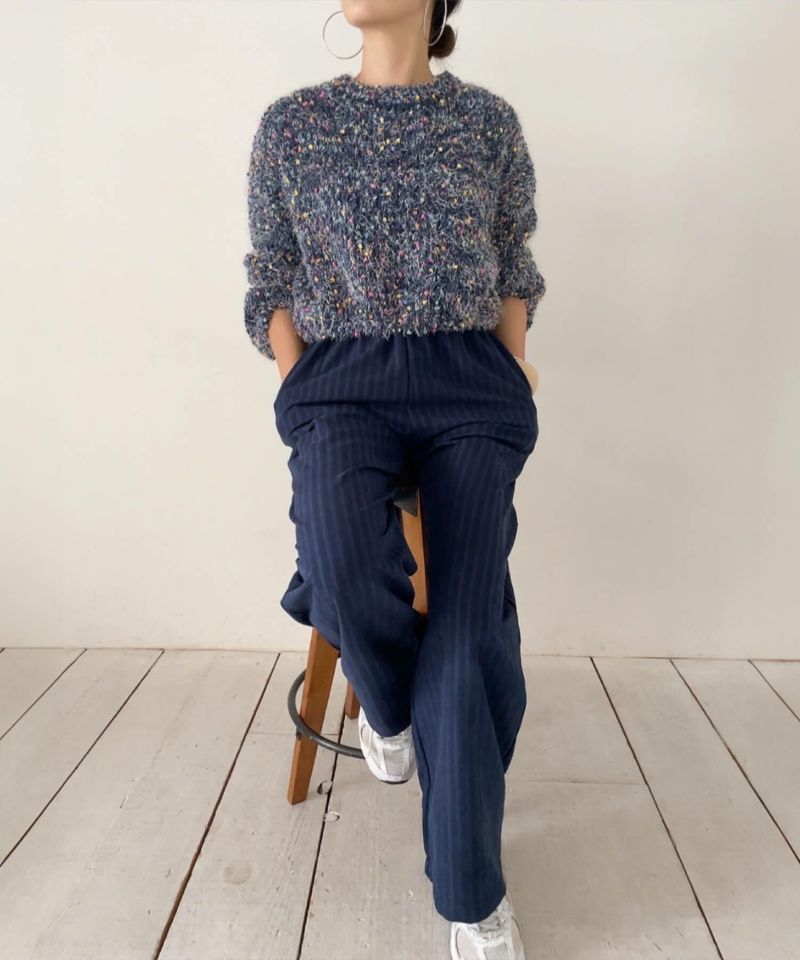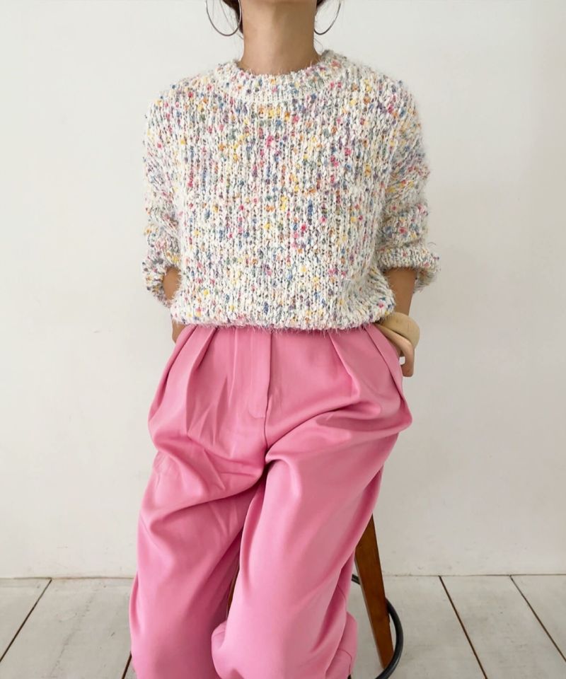 ミックスカーラーの糸を拾ったカラーボトムと合わせれば上級者コーデに◎