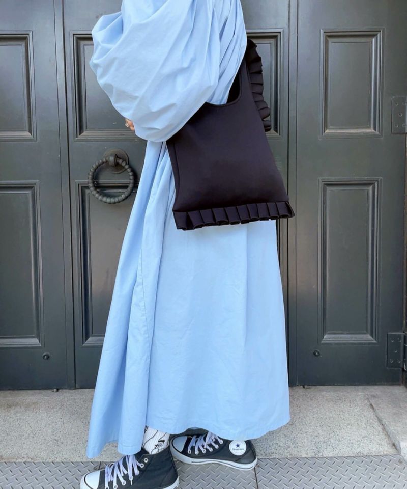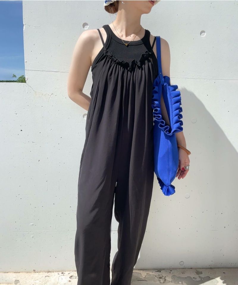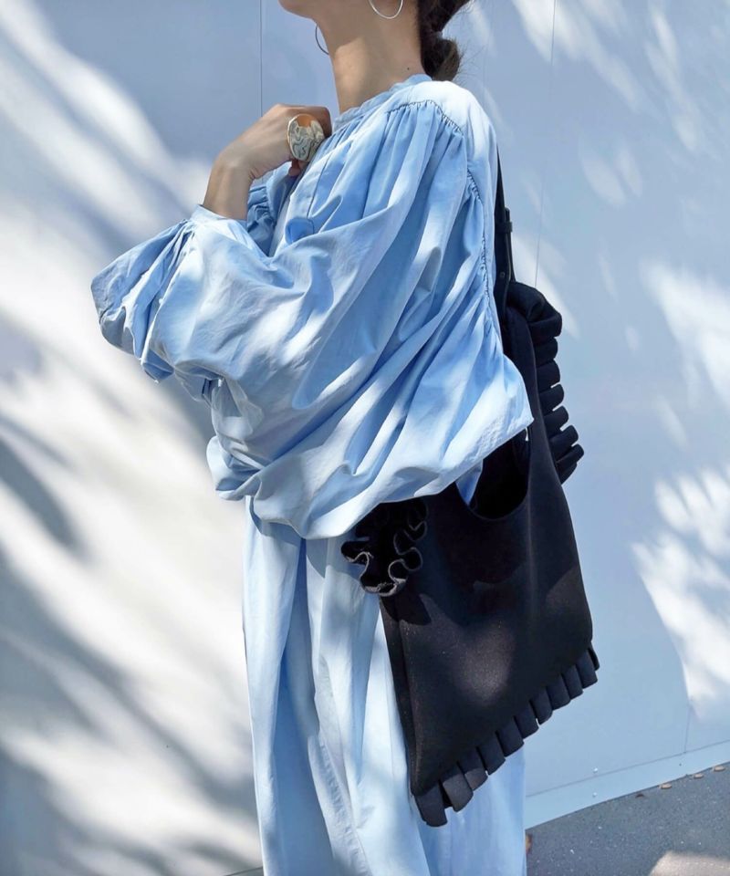 ボックスプリーツのようなタックを用いたカジュアル要素の強いフリルなので、かわいくなりすぎず大人の女性が持ちやすいデザイン。