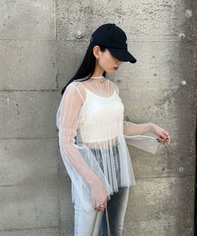 ギャザーデザインが目を惹くトレンド感たっぷりのチュールトップス。