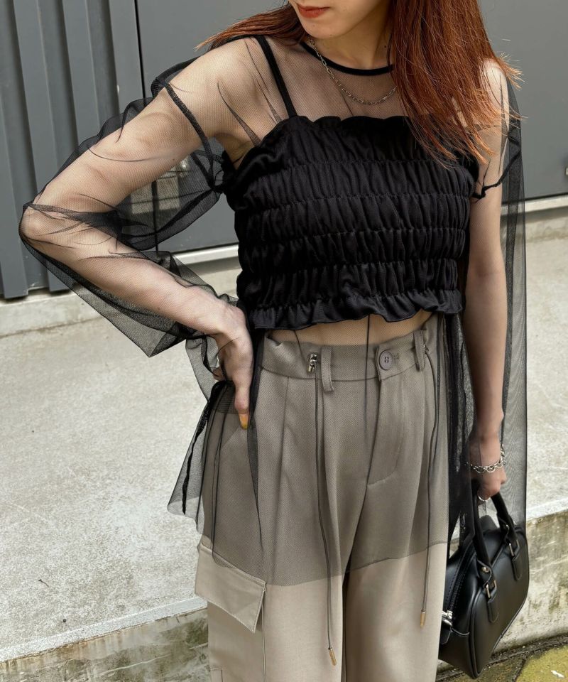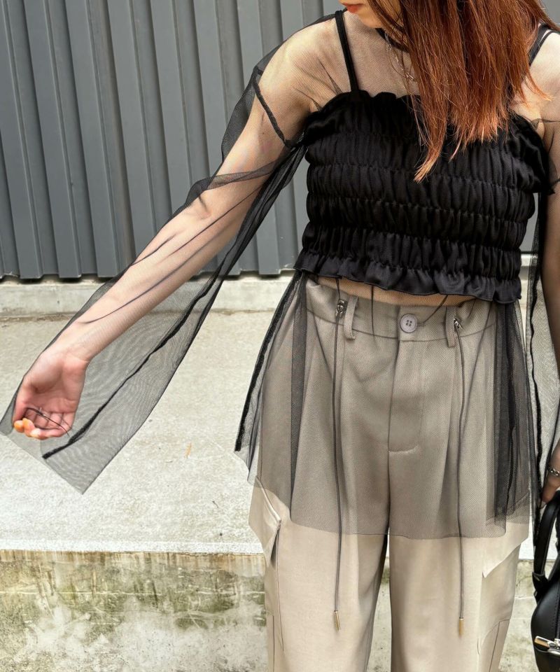 チュールの上からでも、下からでもレイヤード可能でモードな印象になりおしゃれ見え間違いなし。