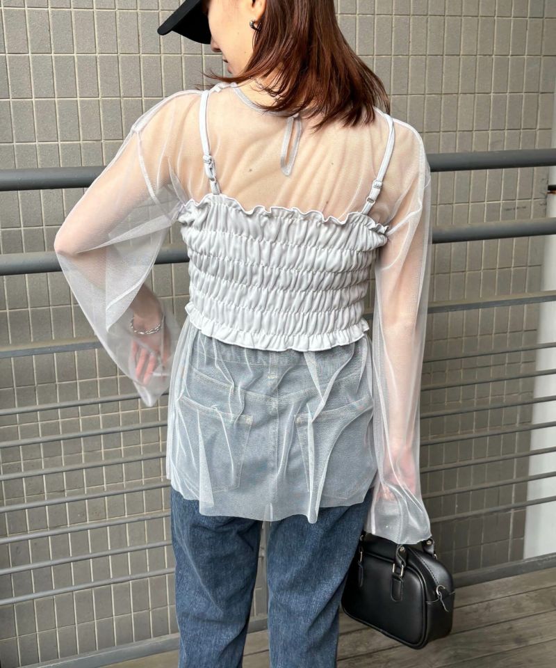 シャーリングビスチェとオーバーサイズのシンプルなチュールトップスがセットになった、着回し抜群のとびきりお得なアイテム。