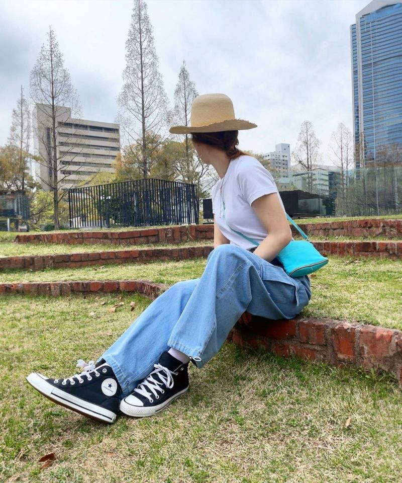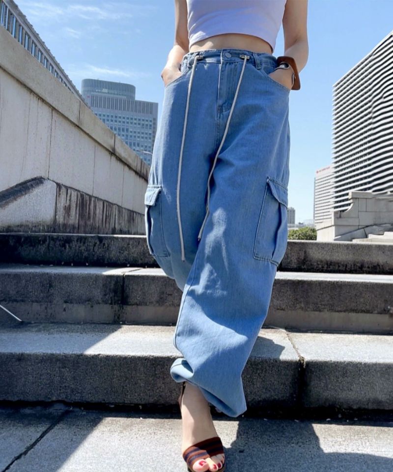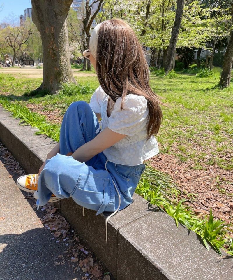 ボトムにボリュームがあるのでショート丈のトップスと合わせて肌見せするとトレンドライクな印象に。