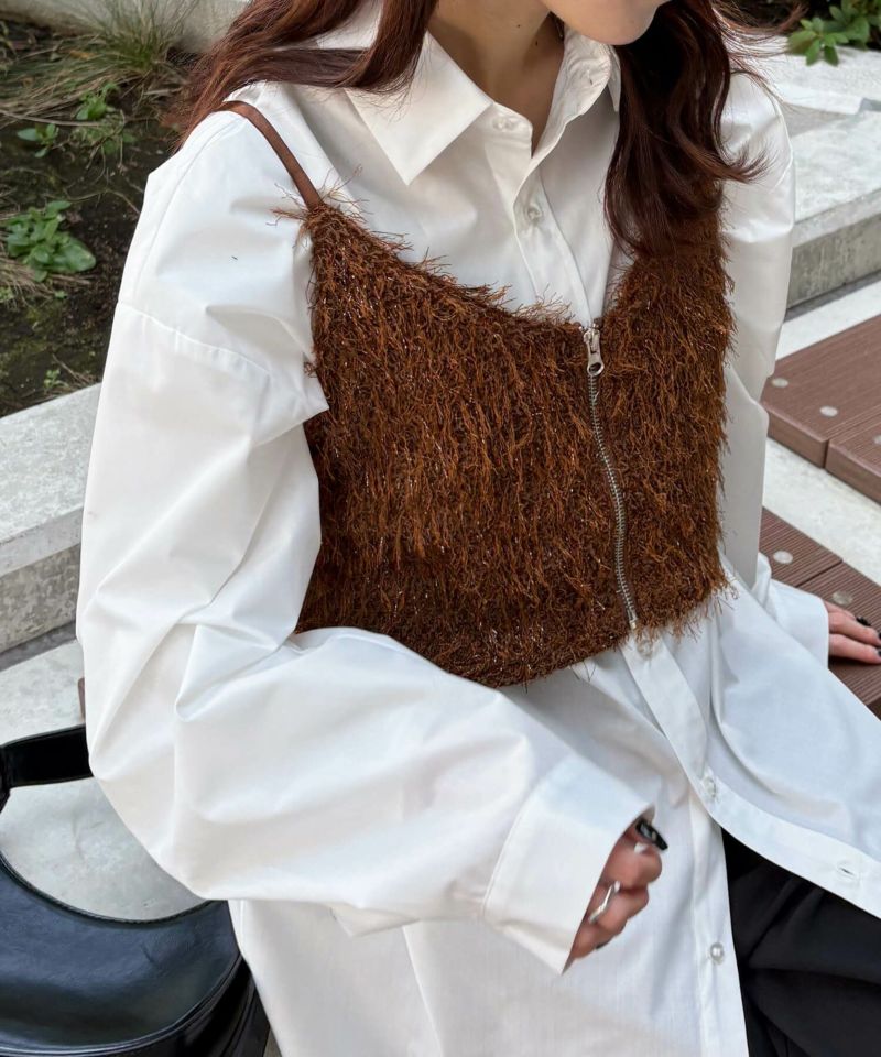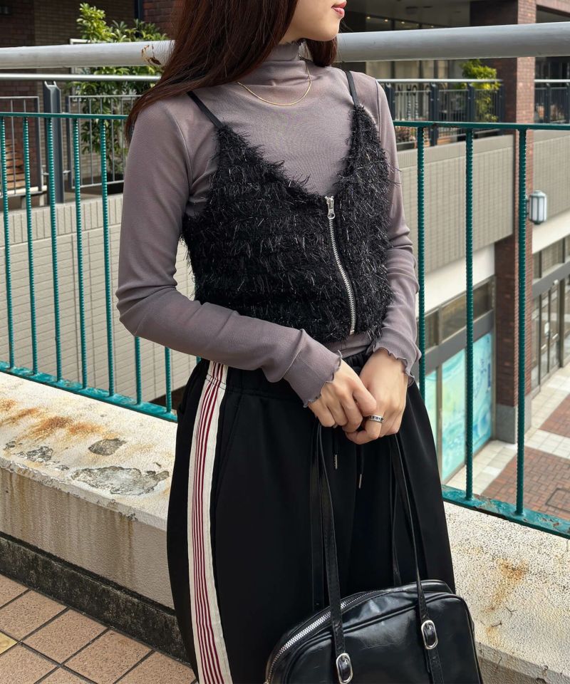 存在感もありつつすっきり着られるショート丈のラメフェザービスチェ。