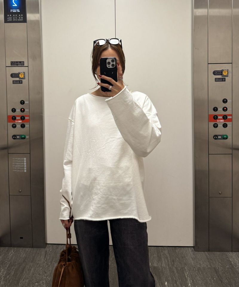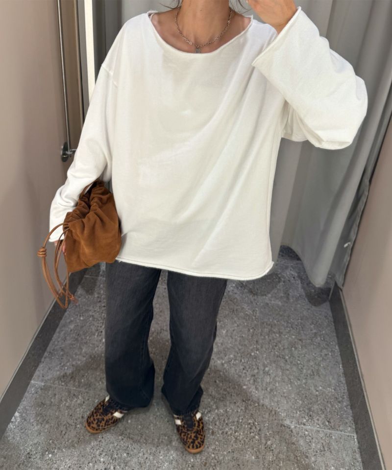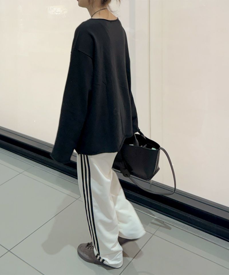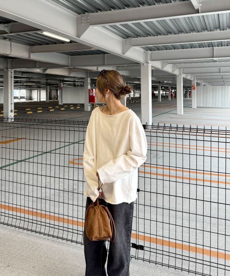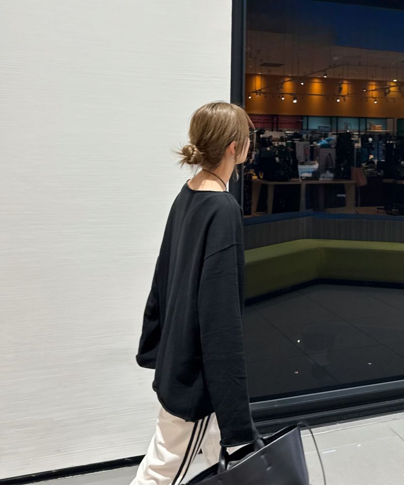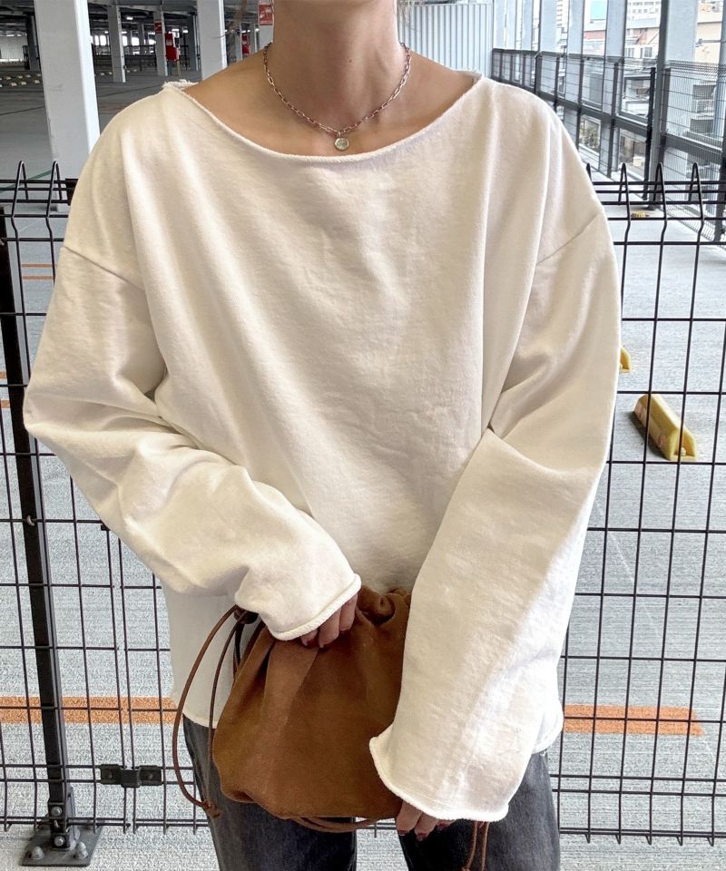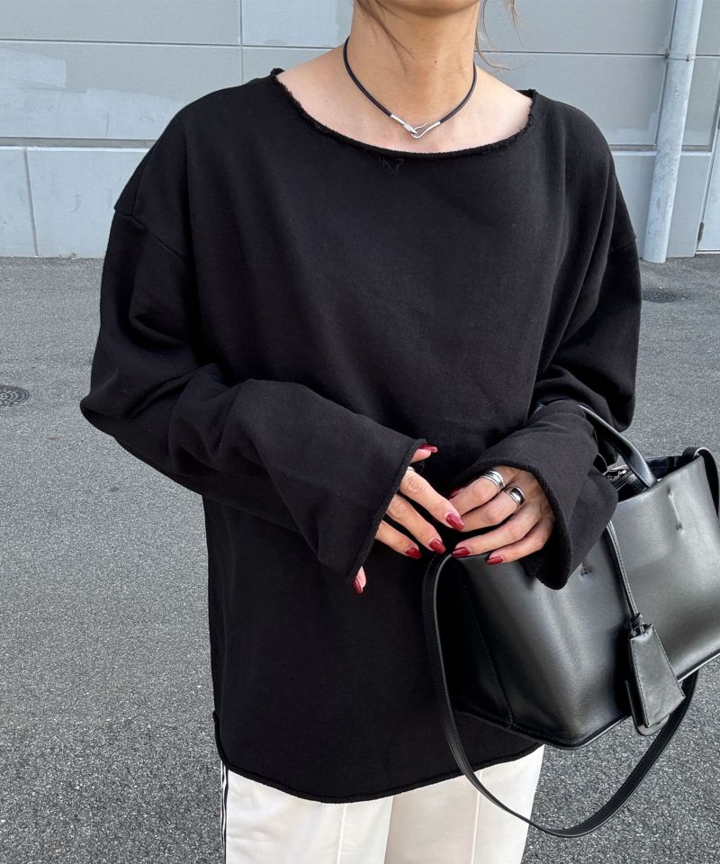 ネックや袖口、裾のカットオフデザインがシンプルなのに抜け感のあるデザイン。