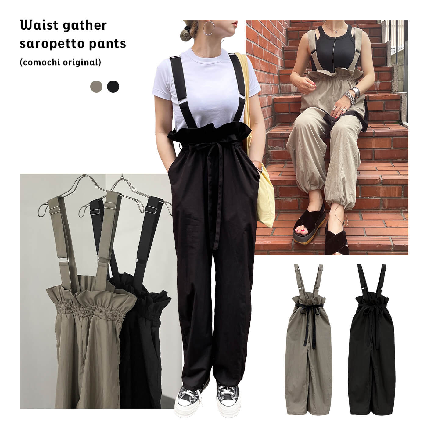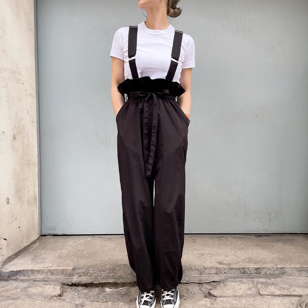 たっぷりとギャザーで女性らしいフォルムにこだわったサロペットパンツ。