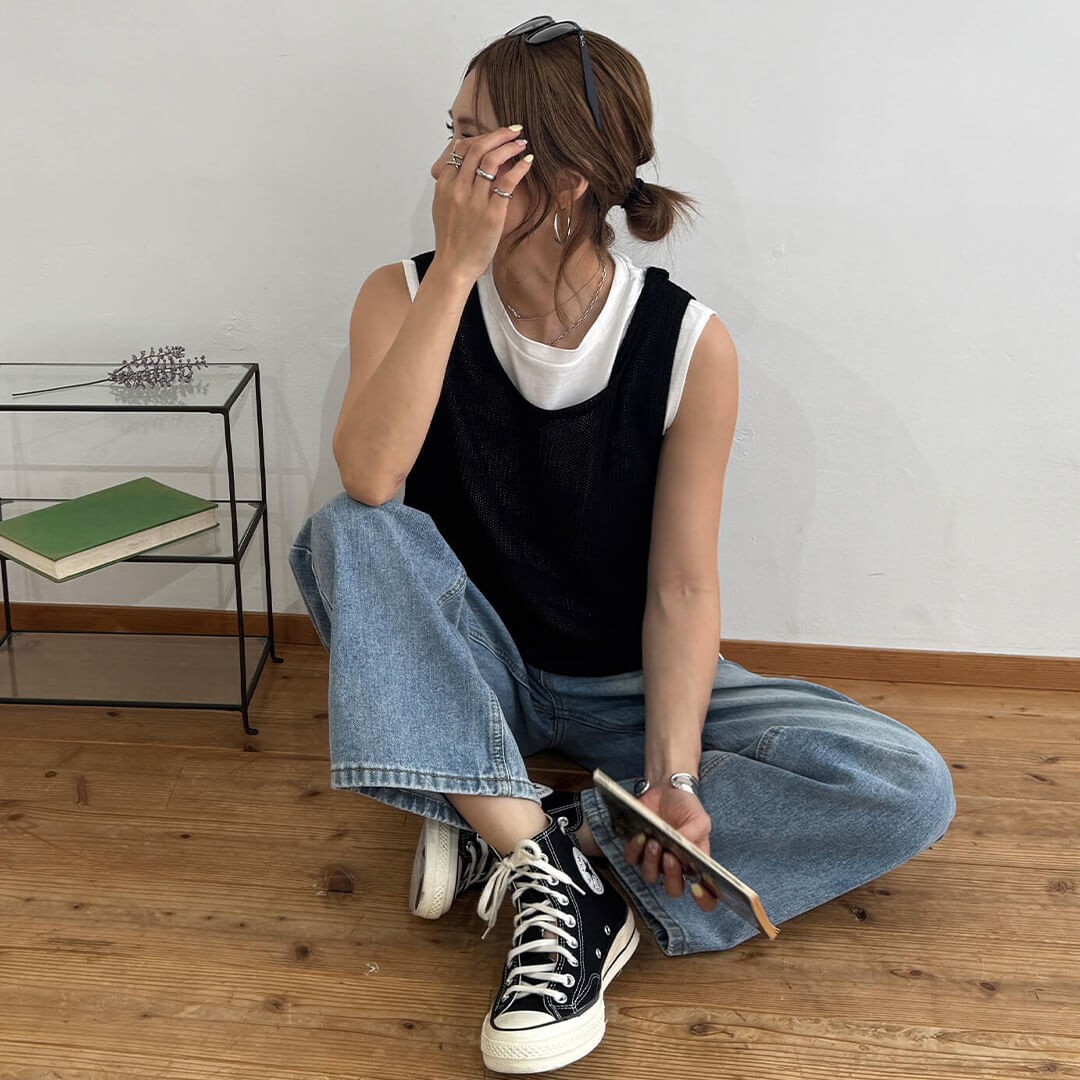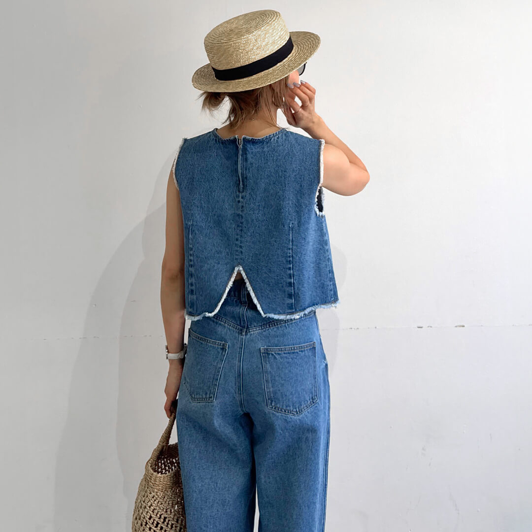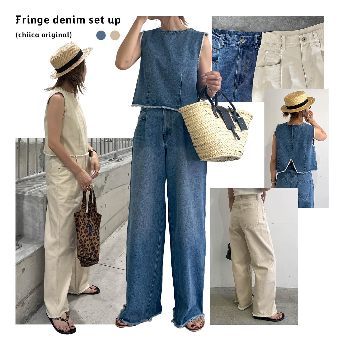 フリンジデザインのノースリーブトップスと、セルフカットが可能なデニムパンツのセットアップ。