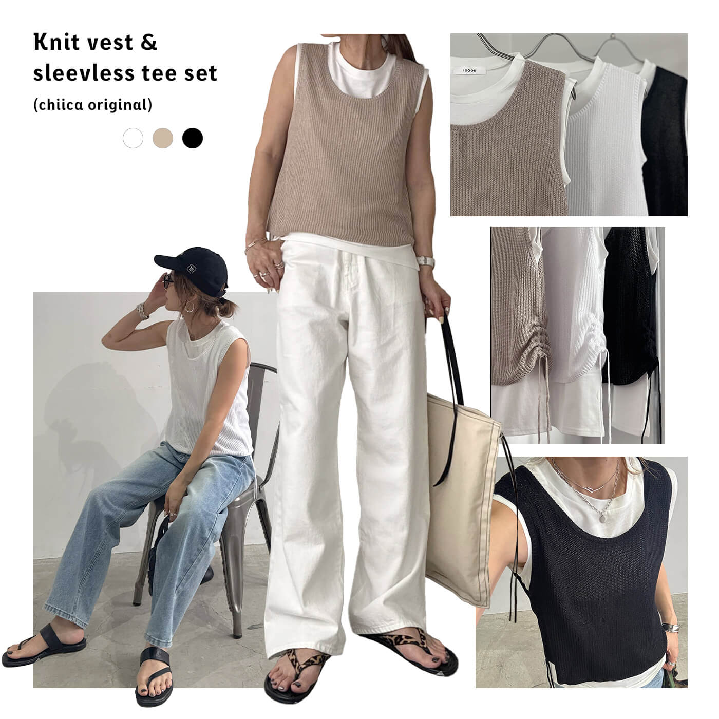 サマーニットのベストとスリーブレスTシャツがセットになったレイヤードトップス。