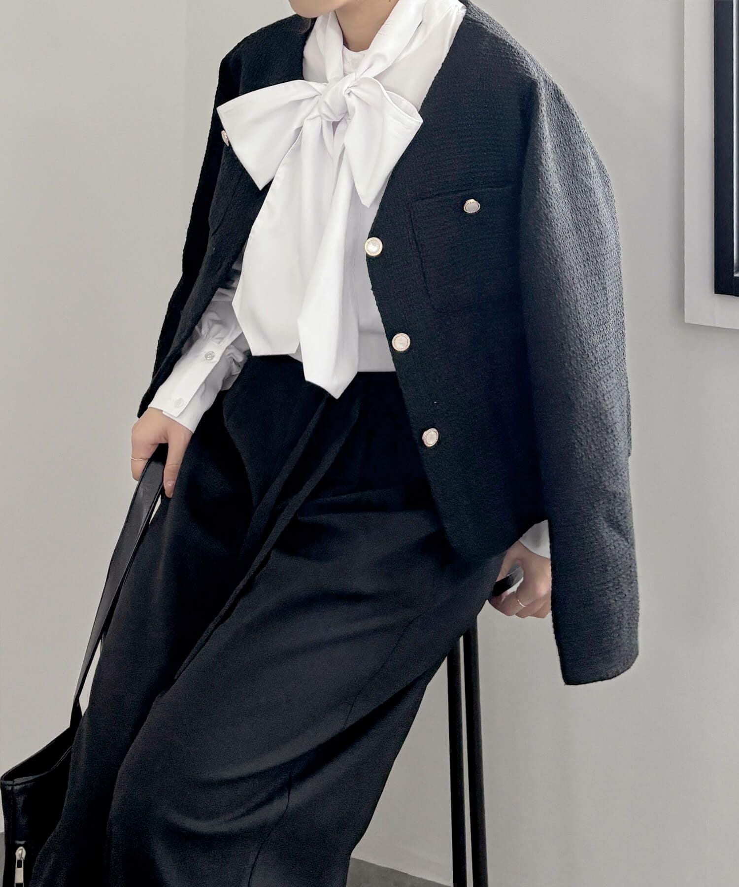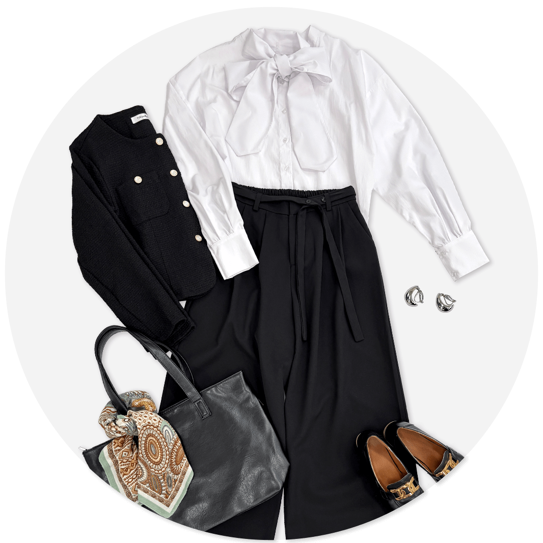 ブラウスはリボンが取り外せて、オフィスカジュアルに大事な着回し力も抜群!
