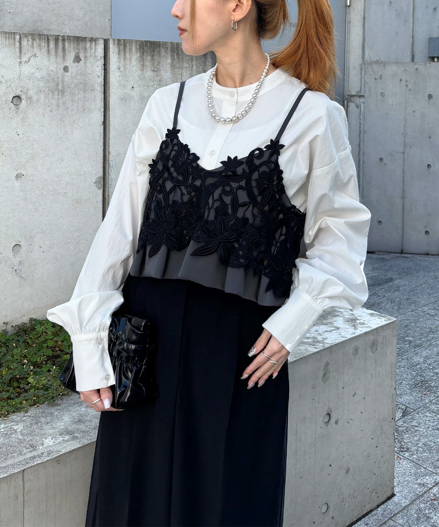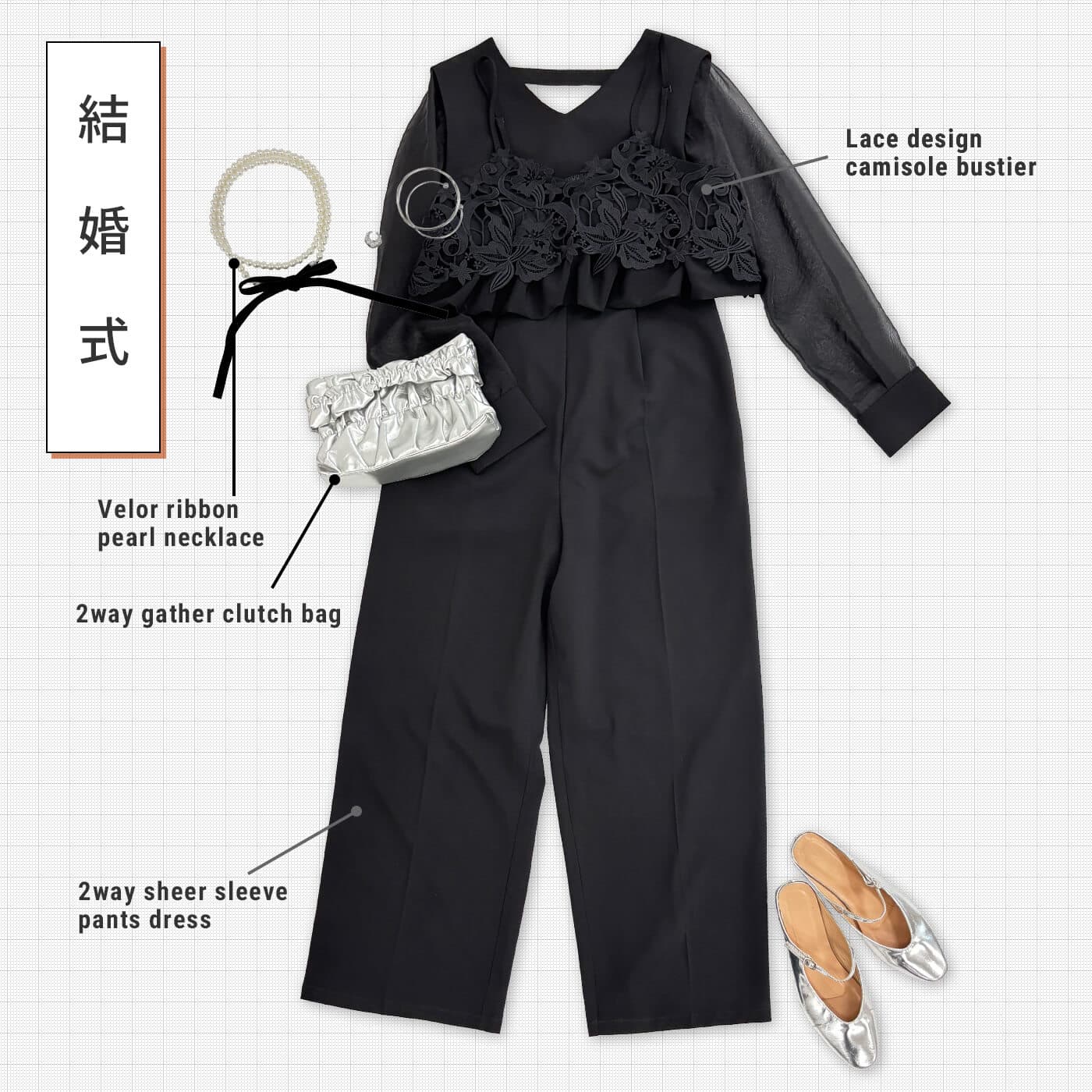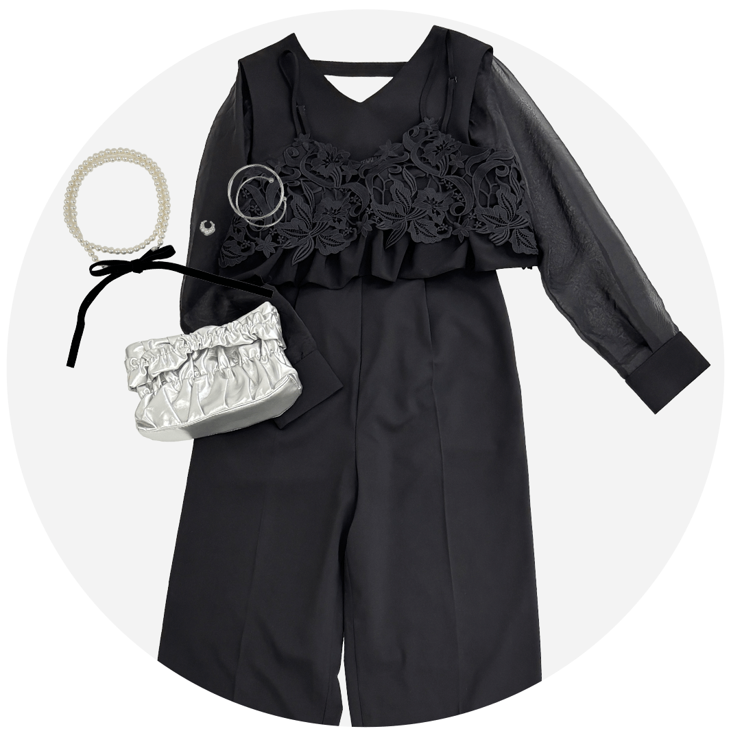 こだわりのパンツドレスに、華やかなレースビスチェをオン。