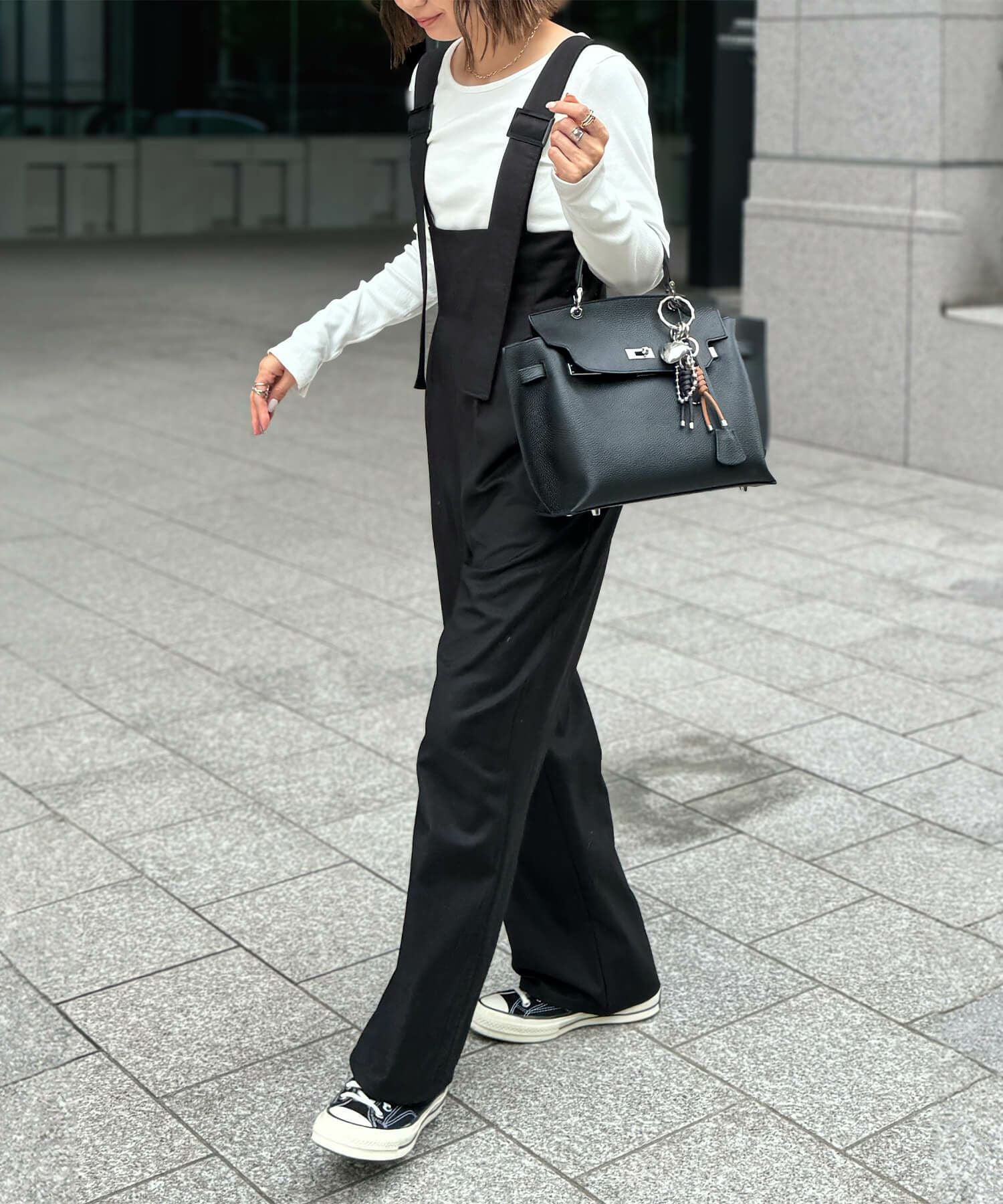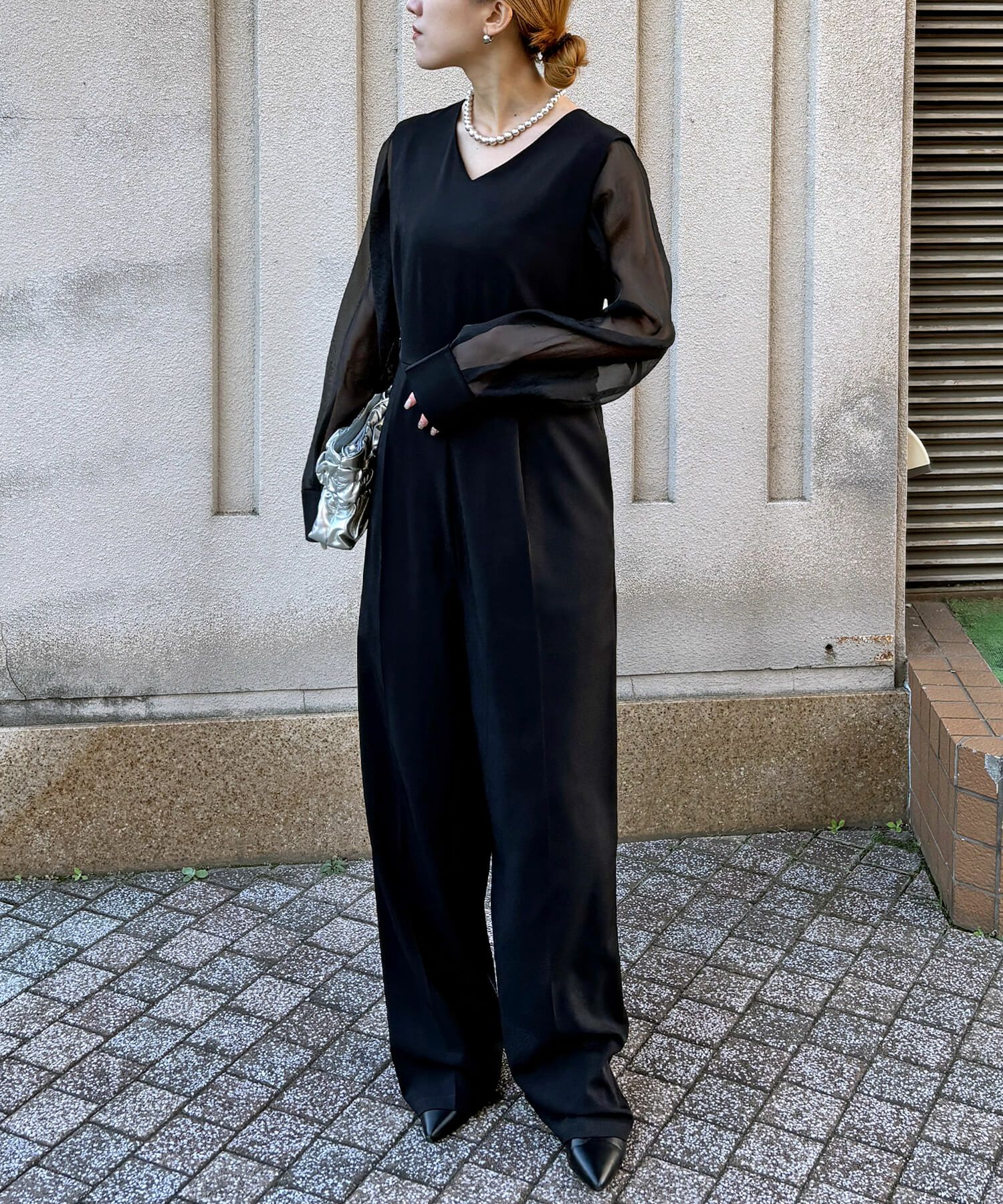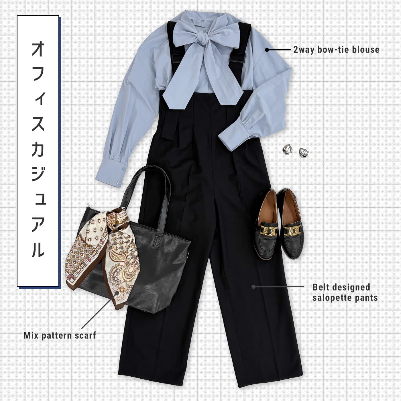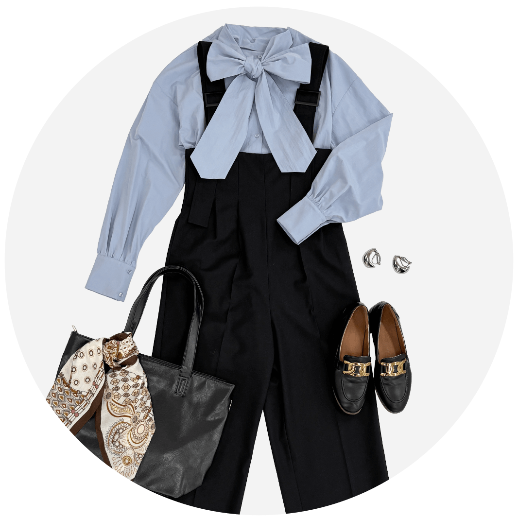 ボウタイブラウスには、スラックス素材のサロペット合わせできちんと見え×大人かわいい×トレンド感。
