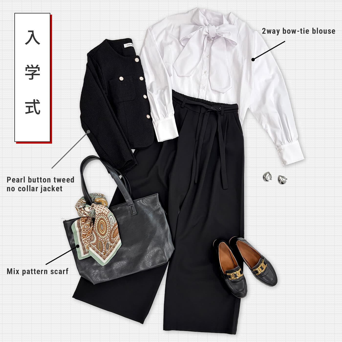 大きめリボンが華やかなボウタイブラウスと王道ツイードジャケットで、子どもの晴れの日を飾るきれいめスタイル。