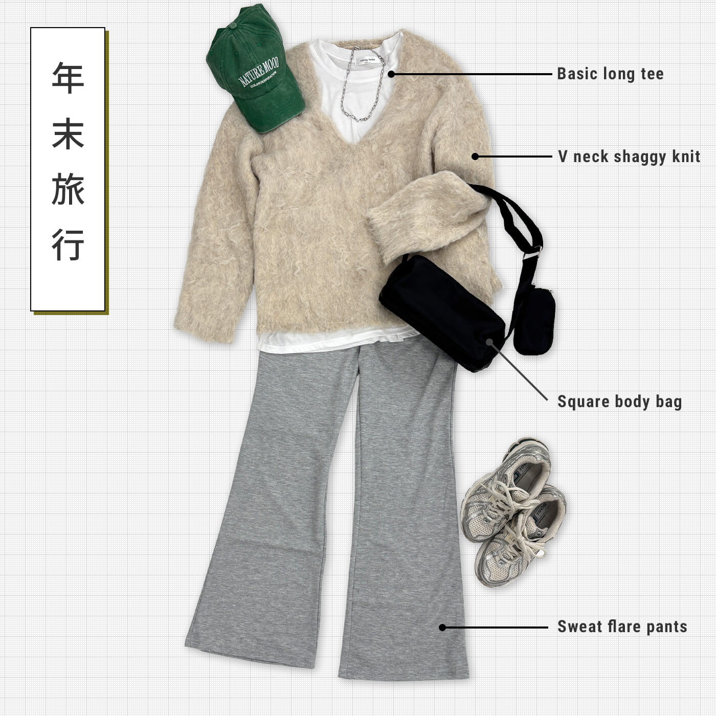 ウエストゴムの細見えスウェットパンツに合わせるゆったりシャギーニットには、垢抜けロンTレイヤードを忘れずに。