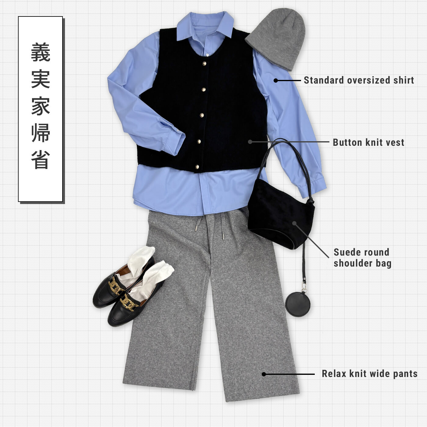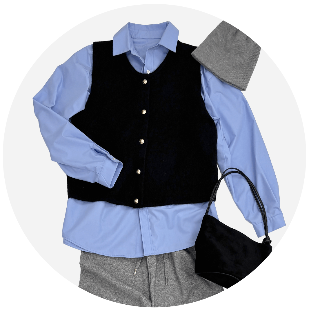 金ボタンのニットベストで上品さもありつつ、差し色のブルー×グレーがたまらない配色◎