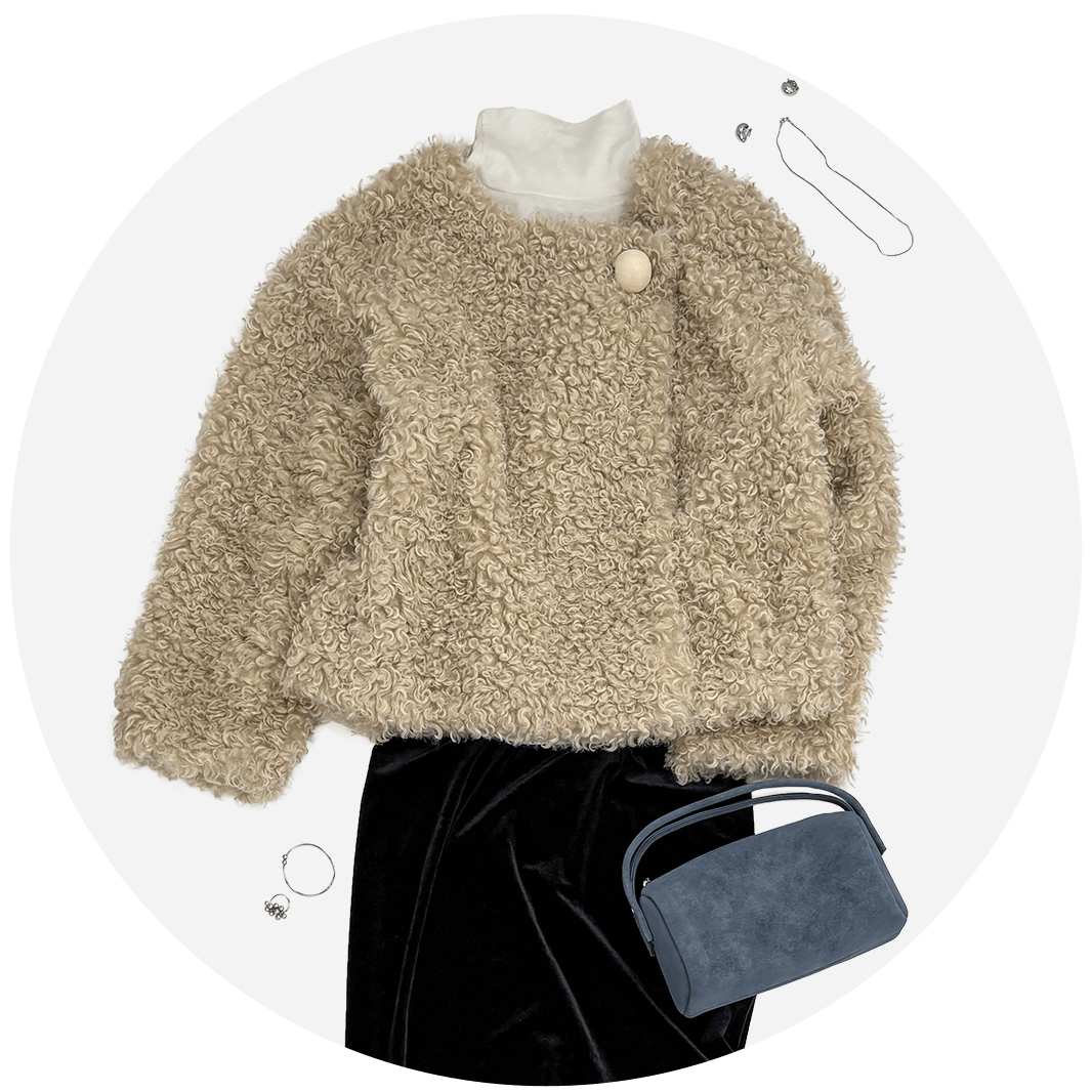 ふわふわのボアアウター&差し色の大人ブルーで他と差のつく主役コーデ。