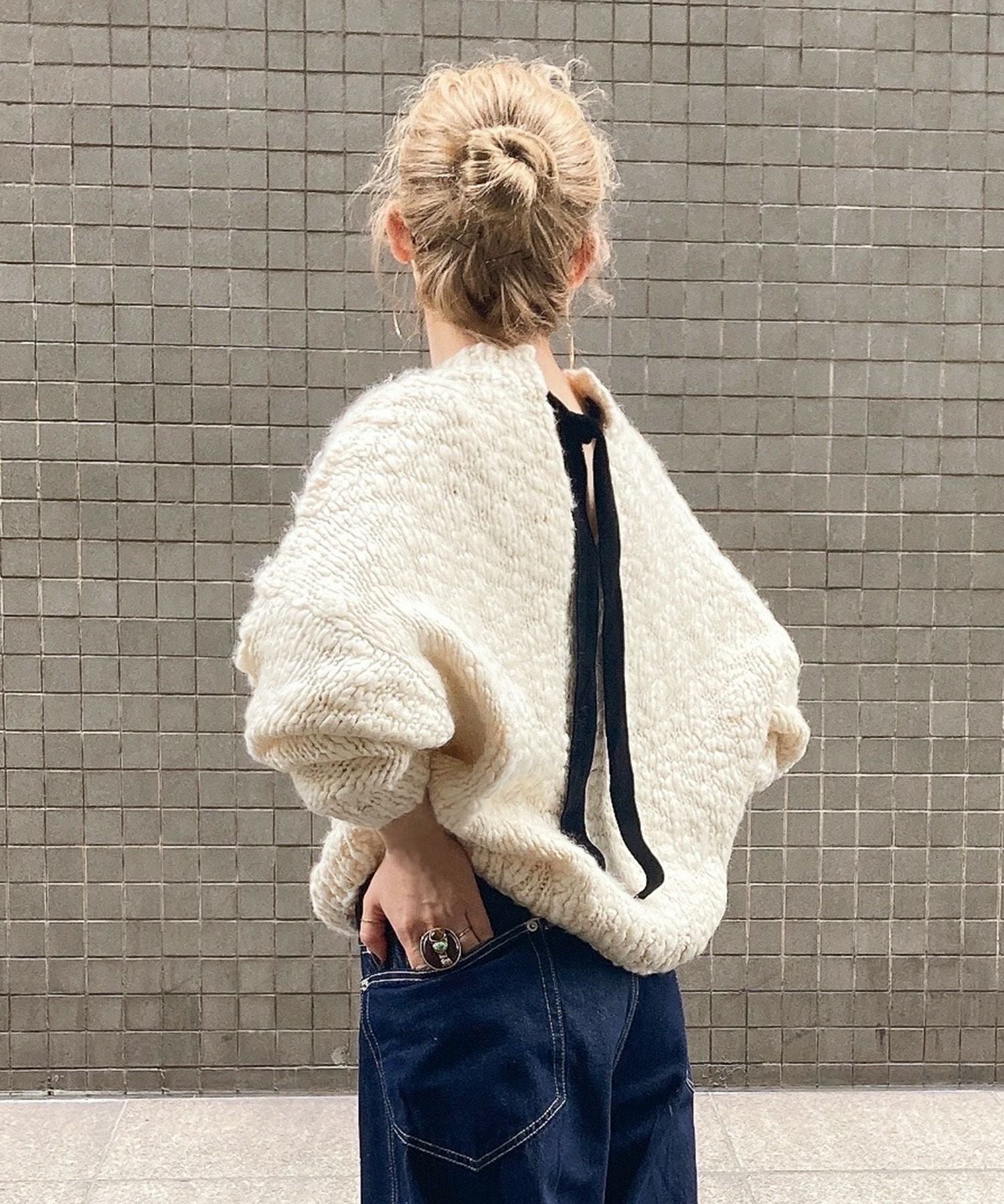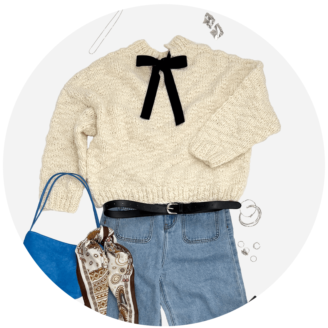 編み目とベロアリボンで女性らしさをたっぷりまとったニット。