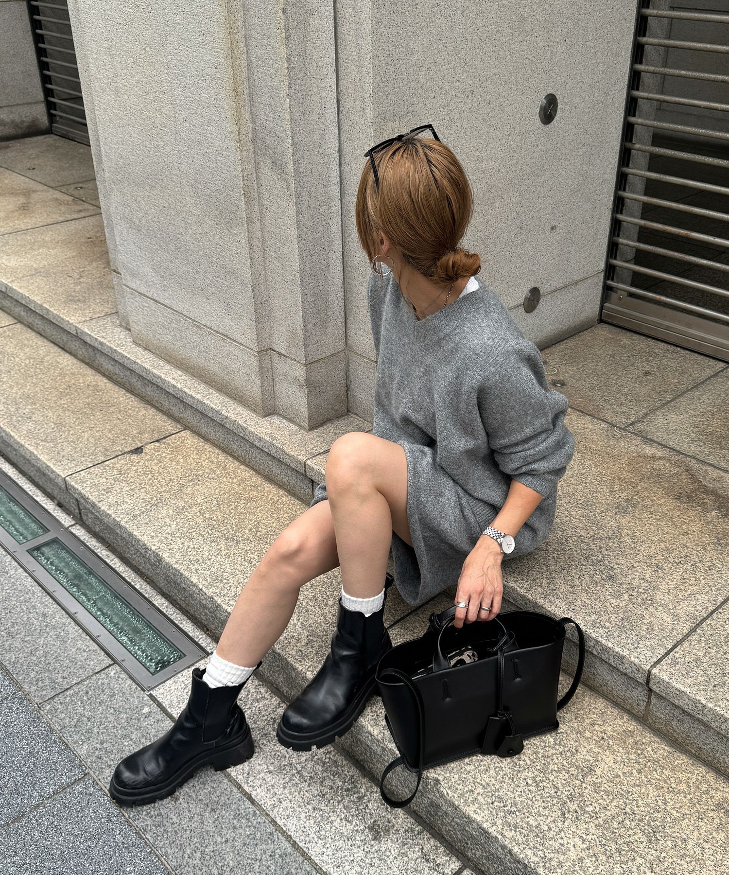 ニットとショートパンツのリラクシーなセットアップ。